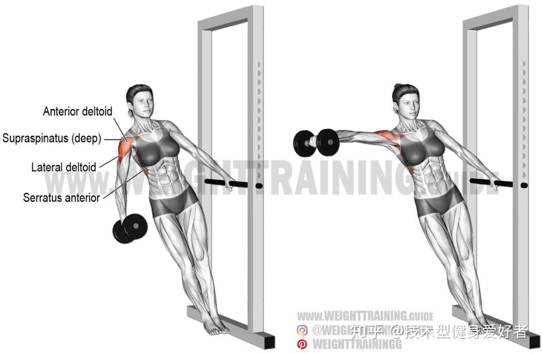 侧平举前三分之一对于冈上肌群刺激更多,超过三分之一后,对于中束的刺激才开始加强,一直到顶峰收缩;所以开始位置稍微倾斜,我们可以省略侧平举的开始阶段,使中束可以全程都能保持高度激活。