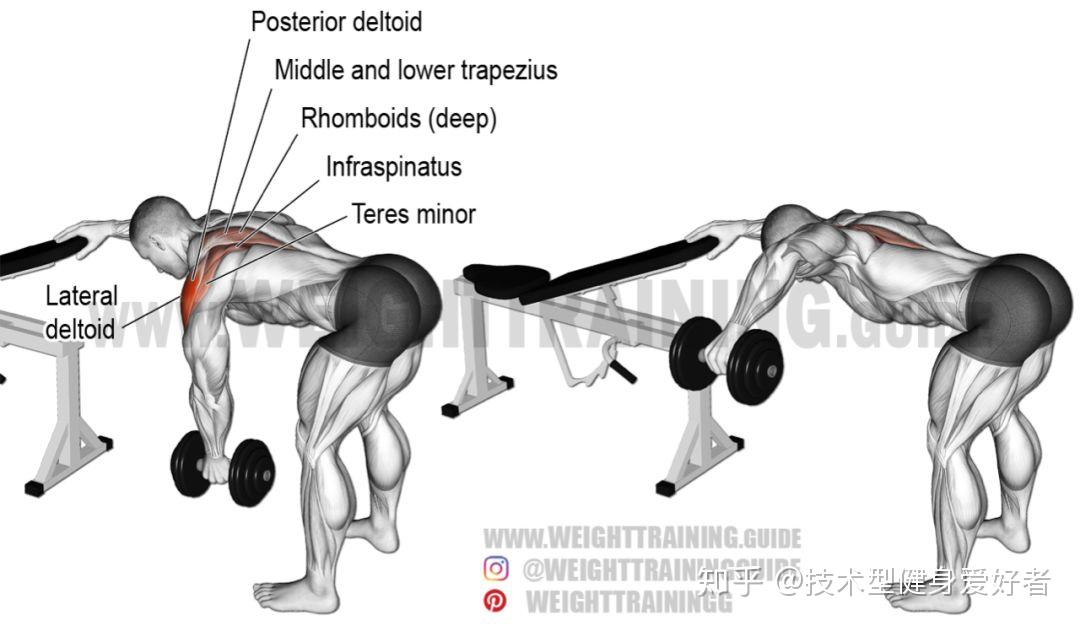 我们可以通过一个变式来实现,背部训练我们的肘部通常是靠近身体向上抬,而三角肌后束训练我们在上抬过程中要将肘部远离身体,肘部和身体躯干形成一个45度的角,这样可以减少背阔肌的参与,由后束来承受大部分的重量。按照肌肉解剖,背阔肌在肩关节做伸展时发力最多,这时肘部贴近身体,当手肘离身体越来越远,背阔肌参与的也就越来越少,而三角肌后束激活程度就越高。