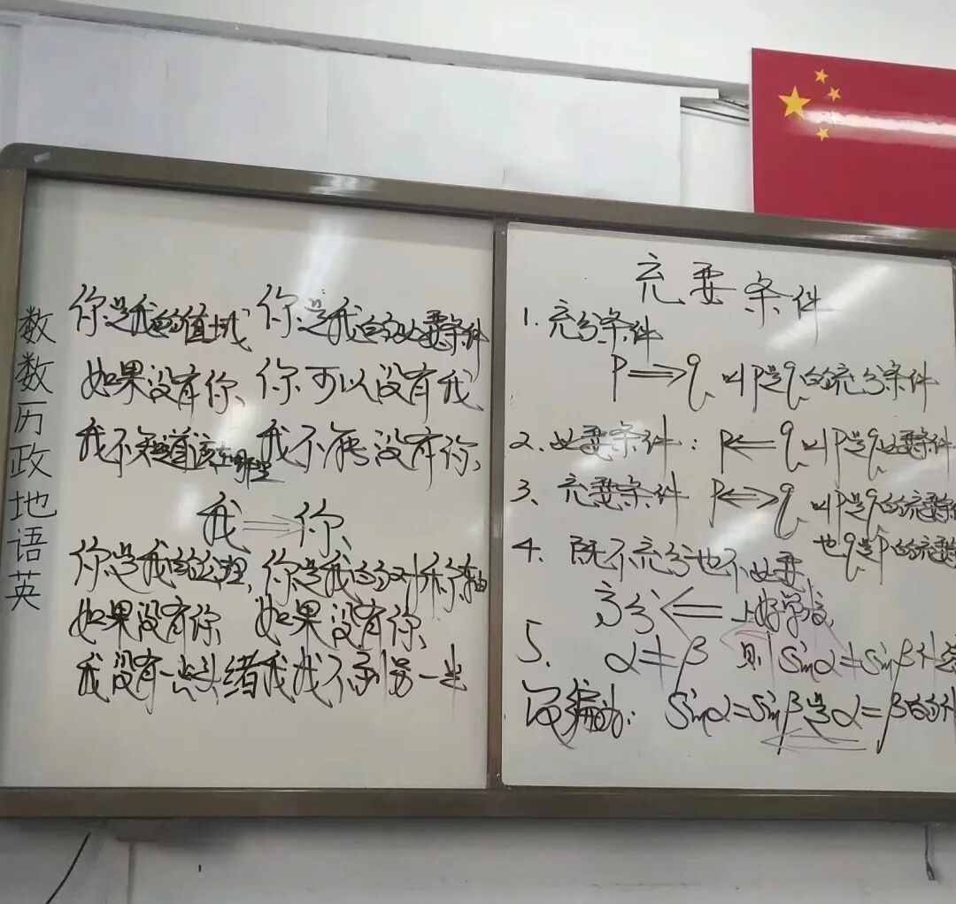 “你是我的值域,如果没有你我不知道该在哪里。”数学老师总能用数学情话激起我们对数学的兴趣,公理,值域亦或是对称轴,每一个元素都有着自己独特的“爱情故事”。仿佛又回到那年夏天,那间教室,夏老头激情澎湃的讲着常用逻辑用语,一支笔,一群青春洋溢的少年,在那个炽热的夏天,书写出自己的人生篇章。 ——新疆乌鲁木齐的罗同学