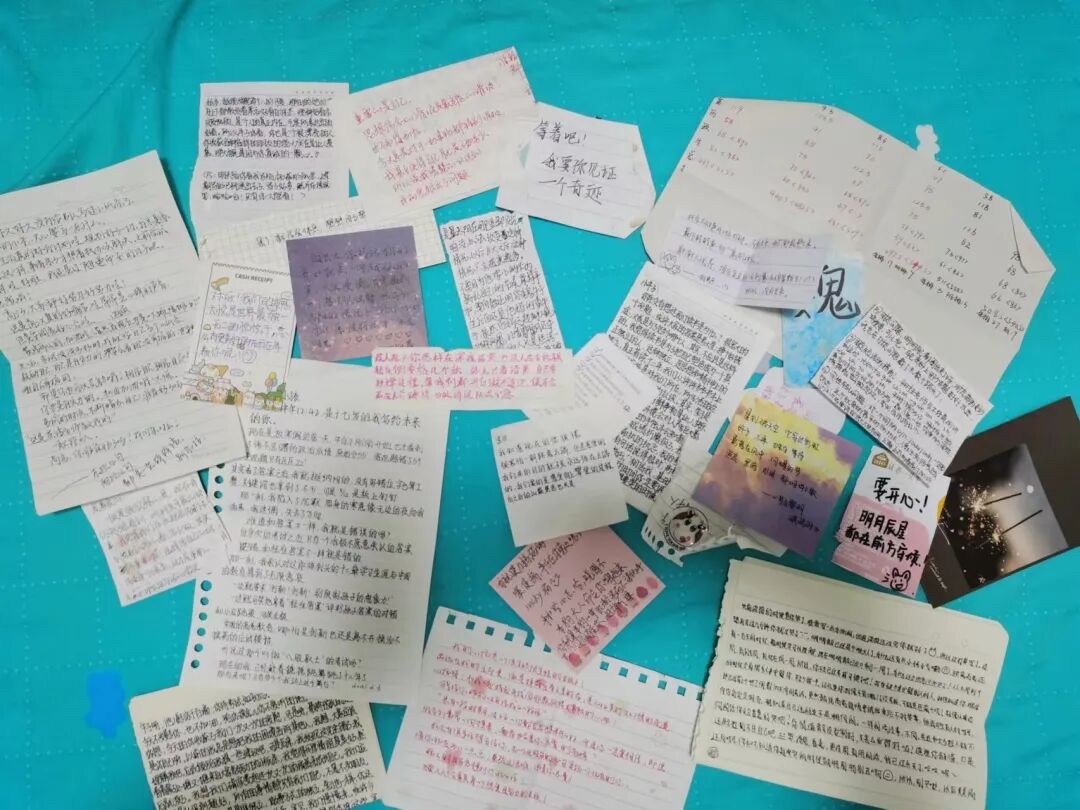照片大概就是一些同学给我的鼓励,我考试考不好压力大,喜欢哭,同学们就写小纸条给我,安慰我鼓励我,我后面收集起来,有满满一个小袋子的纸条。