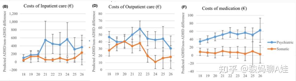其中瑞典的报告中看到,诊断为ADHD儿童(蓝色线),预测在18-26岁时住院(表B)、门诊(表D)、药物(表F)的费用都比一般躯体症状儿童(橘色)就医各种费用高。且药物的费用有逐年增加的趋势。