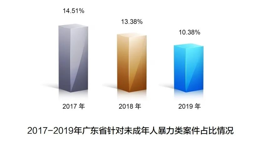 暴力案件方面,2019年,针对未成年人实施故意伤害、故意杀人等行为的,占同期起诉侵害未成年人犯罪案件总数的10.38%,相比2017年有所下降。