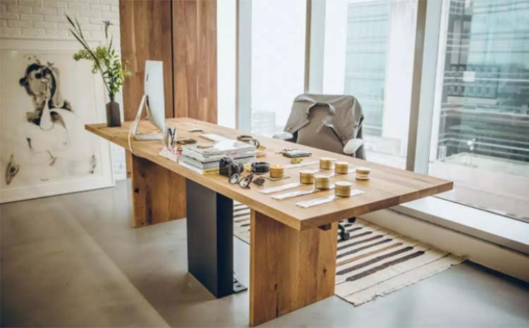 工作室大部分就是原木风,背景墙还有桌子都是木质的,