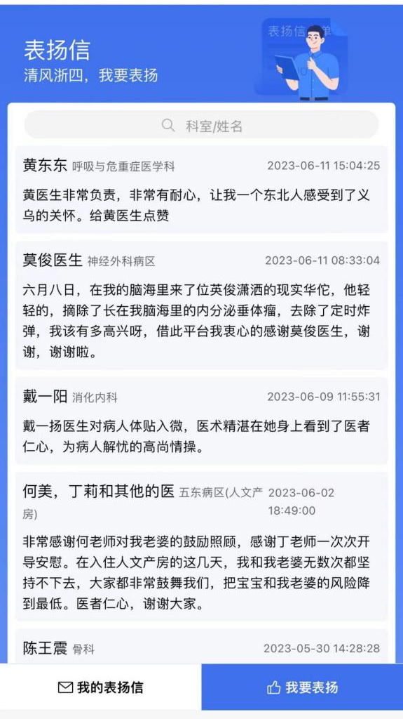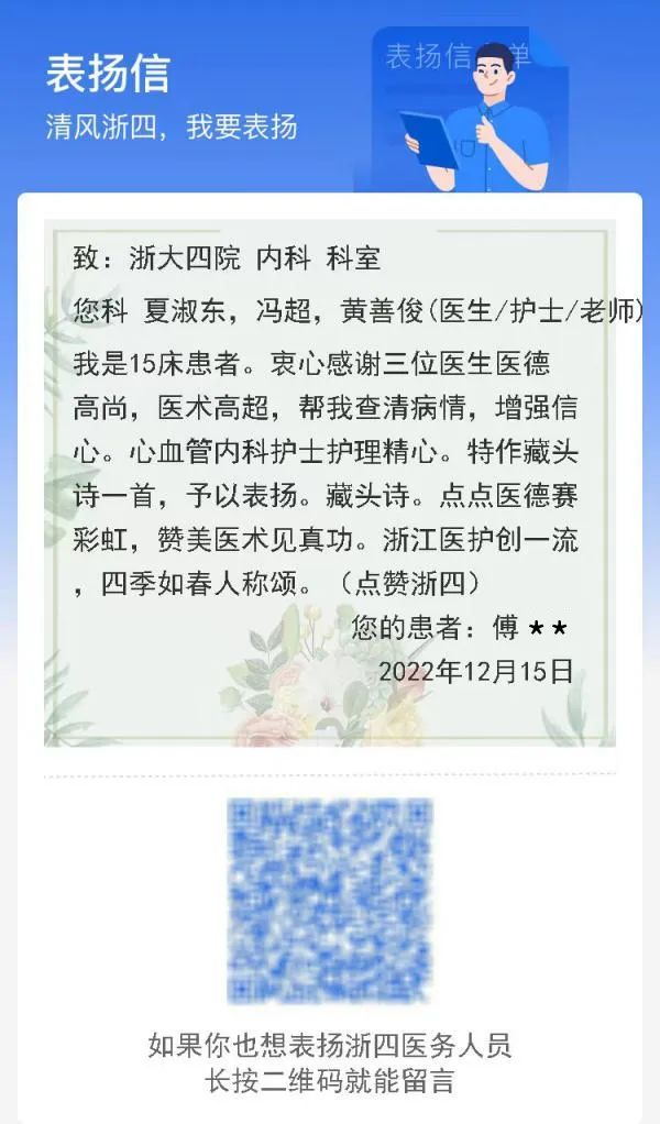 日常工作中,患者为了向医务人员表示感谢,除了送锦旗、写感谢信以外,总会想到用“红包”的形式来表达,为此医院纪检部门“修渠建道”,在微信公众号开通“清风浙四表扬信”功能,将这份信任引导至精神鼓励。该功能上线一年以来,微信后台已收到感谢信370余封,表扬了65个科室269位工作人员,其中不乏情真意切、感人至深的表扬信,“我是15床患者,衷心感谢三位医生医德高尚、医术高超,帮我查清病情,增强信心。心血管内科护士护理精心,特作藏头诗一首,予以表扬:点点医德赛彩虹,赞美医术见真功;浙江医护创一流,四季如春人称颂。(点赞浙四)”