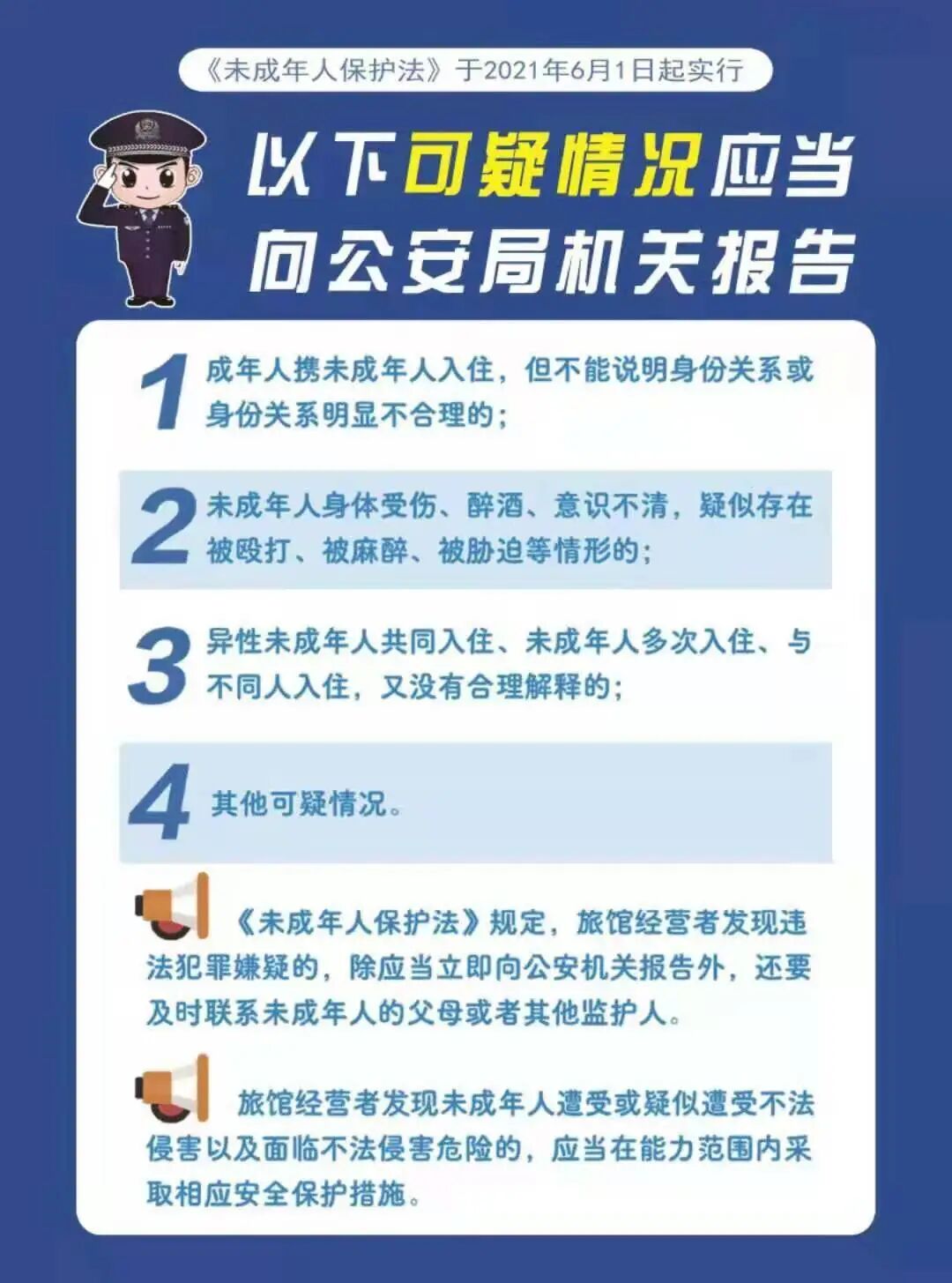 必须立即向公安机关报告可疑情况,并及时联系未成年人的父母或其他监护人,同时采取相应安全保护措施。如成年人携未成年人入住,但不能说明身份关系或身份关系明显不合理的;未成年人身体受伤、醉酒、意识不清,疑似存在被殴打、被麻醉、被胁迫等情形的;异性未成年人共同入住、未成年人多次入住、与不同人入住,又没有合理解释的;以及其他明显不合常理的可疑情况。