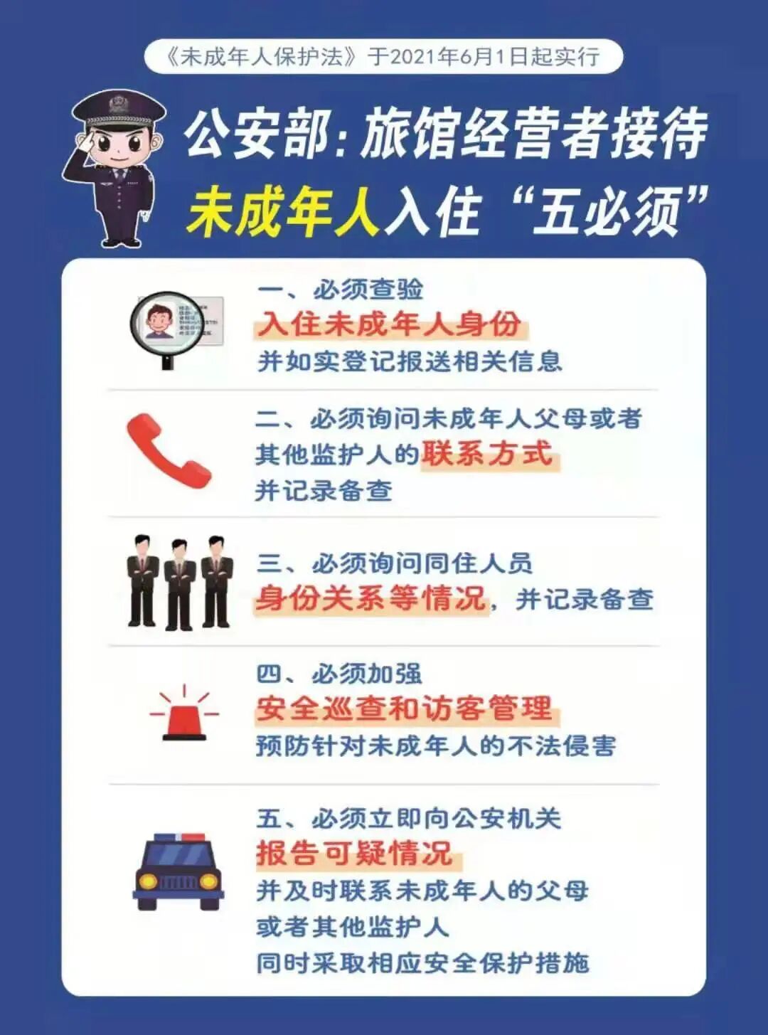 为防范在旅馆发生侵害未成年人案件,保护未成年人身心健康,根据《未成年人保护法》《治安管理处罚法》《旅馆业治安管理办法》等法律法规规定,旅馆经营者接待未成年人入住应做到“五必须”: