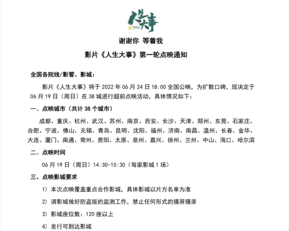 之前不是没有多轮点映的电影。去年暑期档主打口碑的《人生大事》《独行月球》都曾开启两轮点映。《人生大事》首轮点映选择了38个二线城市,每家影院提供场次仅有一场,时间控制在下午两点半至三点半,次轮点映则安排在公映前一天晚上,范围扩大至全国,场次、时段更加宽松。同样,《独行月球》首轮点映也以二线城市为主,且场次较少,直到公映前一天才扩大放映范围。