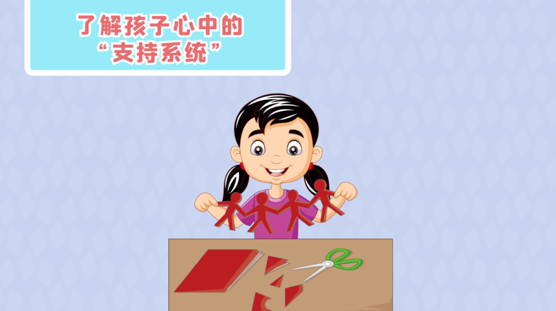 可以让孩子玩剪纸游戏“支持小队”,就是剪出手拉手的几个小人,问问孩子遇到困难时,谁能支持你、安慰你,就可以了解孩子在学校的人际关系,有没有朋友,跟朋友间的关系怎么样。