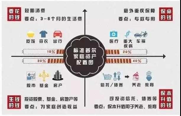 这张标准普尔家庭资产配置图,其实有点金融知识的人都能看出来,这里面是有点问题的,第一个象限“要花的钱”和第二象限“保命的钱”严格说,应该都是支出,属于负债项,而“生钱的钱”和“保值的钱”才是资产配置。其次,这个图没有考虑家庭的基本生活支出和收入之间的关系,也没有考虑时间在资产中的作用。如果真的按这个图来操作,起码对于一个月工资挣8千,房租交5千来的北漂一族就不可行……