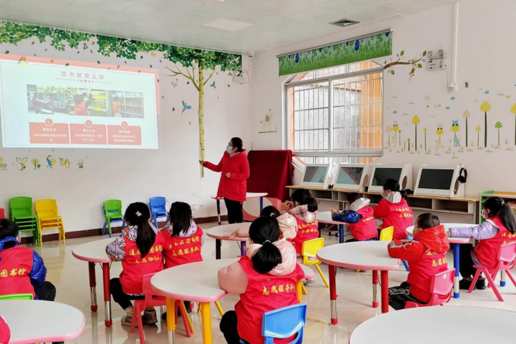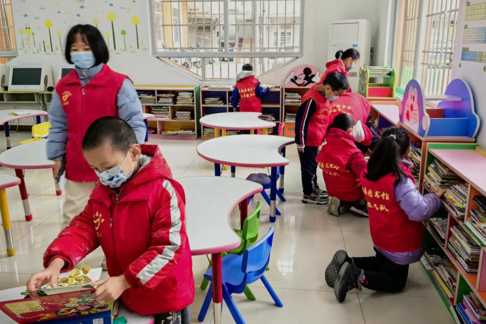 “小小图书管理员”培训结束后,学生志愿者参与图书管理志愿服务活动,协助图书整理上架。