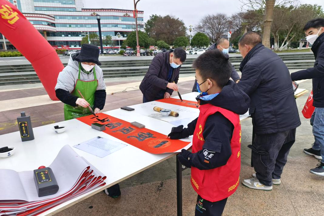过新年,贴春联,蕴含着人们对新一年的美好憧憬。学生志愿者参与送春联活动,协助活动的开展。