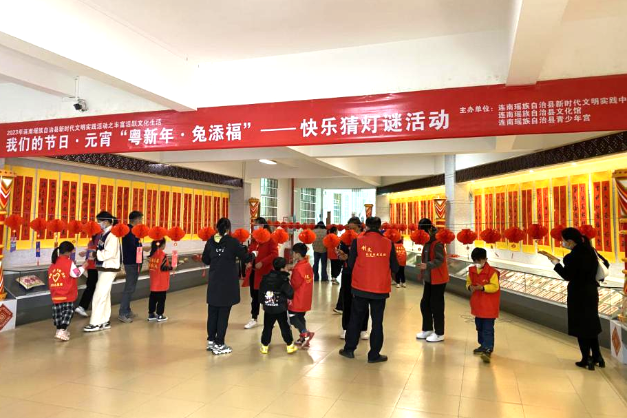 学生志愿者在县文化馆一楼展厅参与我们的节日·元宵“粤新年·兔添福”——快乐猜灯谜活动,协助活动的开展。