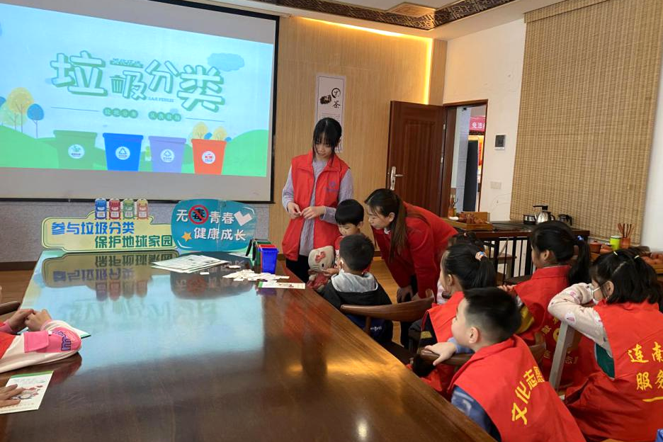 学生志愿者在县文化馆参与垃圾分类培训活动,不仅可以提高未成年人环境保护的意识,还为日后的垃圾分类志愿活动打好基础。