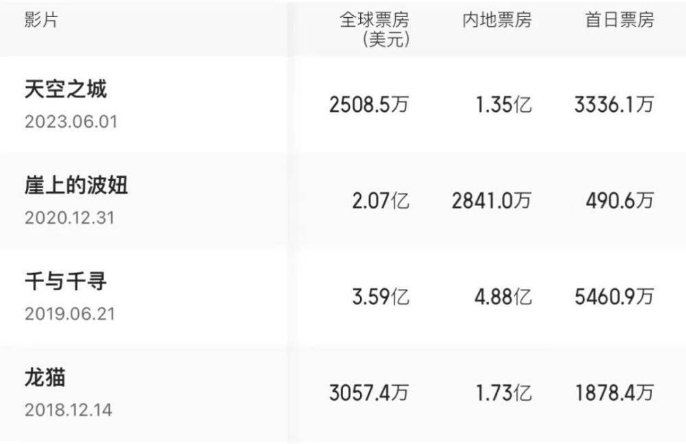 客观来说,即便是宫崎骏,其作品在内地市场的表现也是有较明显上限的。在引进过的四部宫崎骏作品中,表现最好的是4.88亿元的《千与千寻》,今年六一档上映的《天空之城》以及老片《龙猫》票房产出均在1亿+程度。而在2020年跨年档引进的《悬崖上的波妞》,累计票房仅有2841万元。