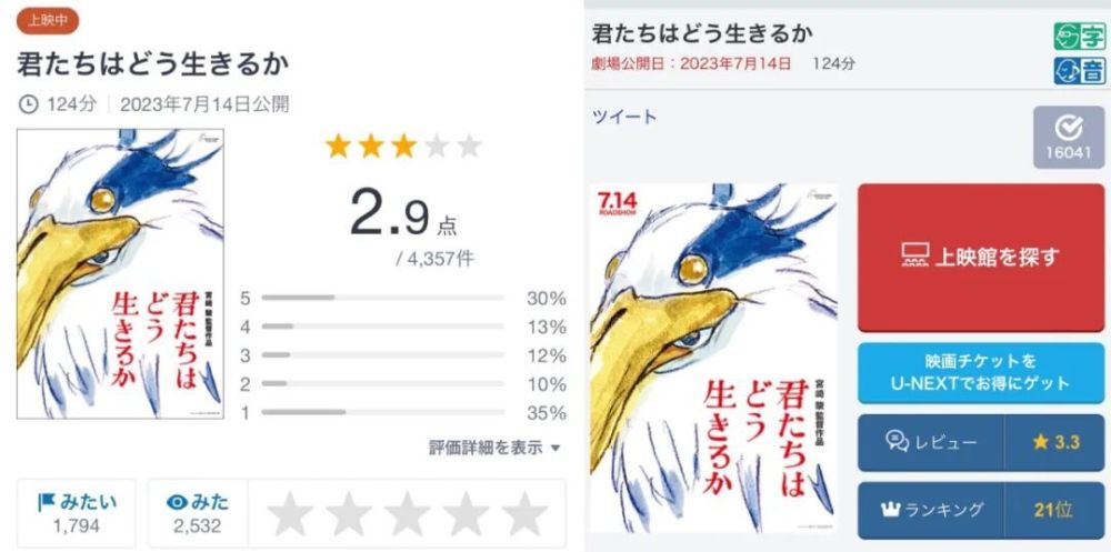 目前《你想活出怎样的人生》在日本雅虎电影和映画.com两家日本网站上的评分分别为2.9分和3.3分(5分制),打出满分和一星的观众都不在少数。