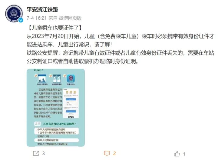 从2023年7月20日开始,儿童(含免费乘车儿童)乘车时必须携带有效身份证件才能进站乘车。忘记携带儿童有效证件或者儿童有效身份证件丢失的,需要在车站公安制证口或者自助售取票机办理临时身份证明。换句话说,儿童乘车一定要带相关证件。