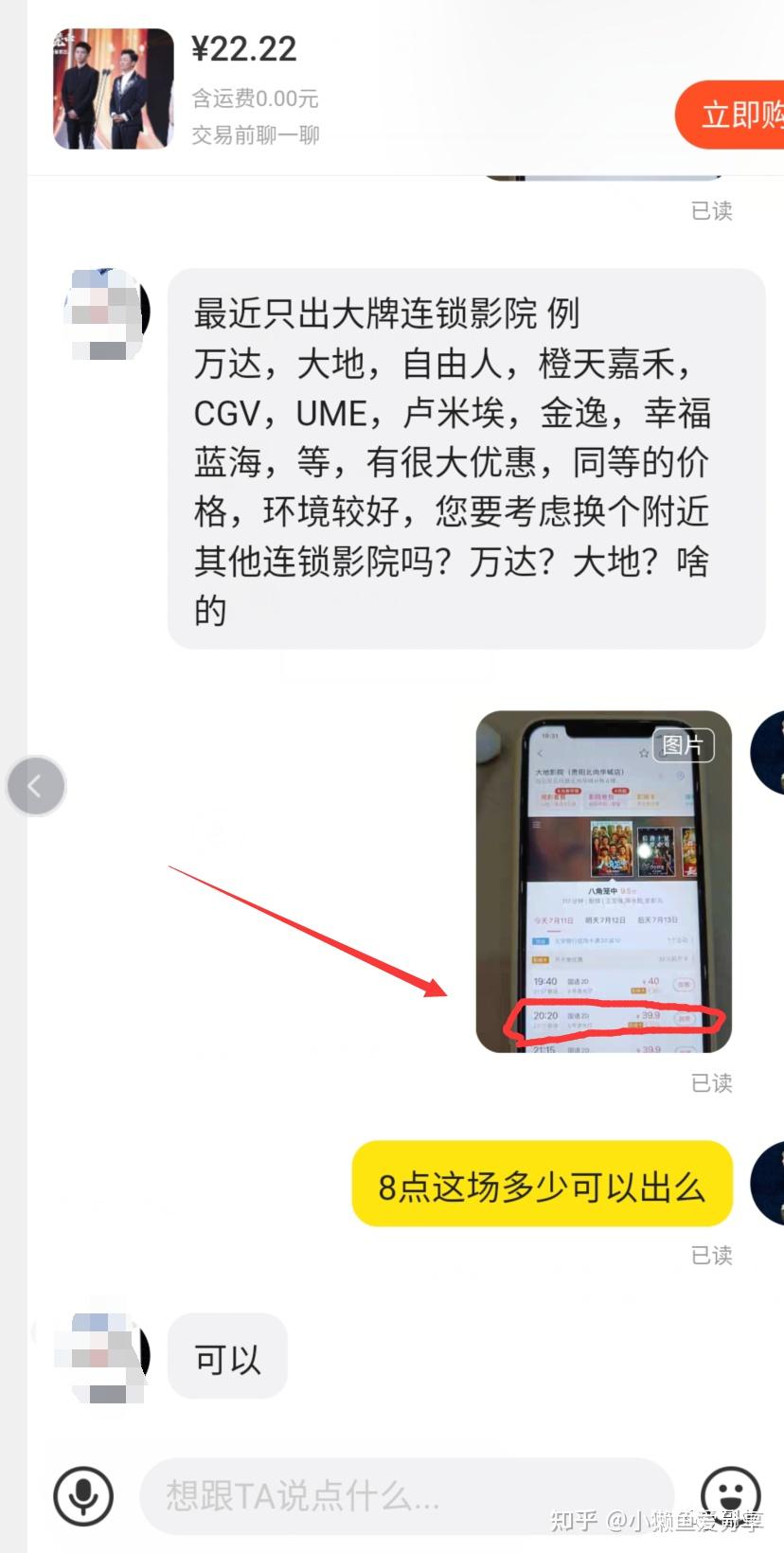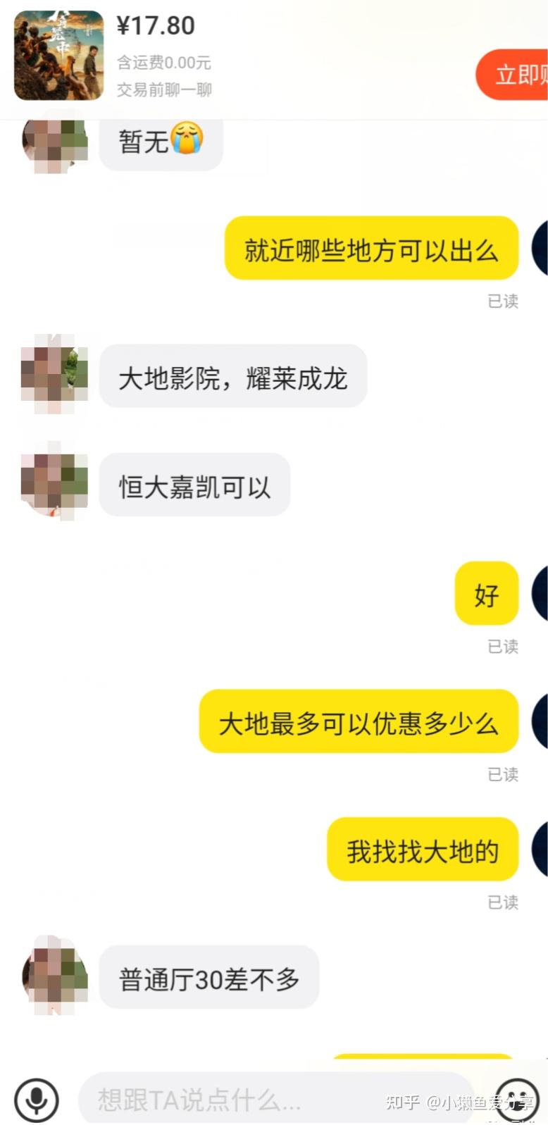 我与几个票务代理在闲鱼上沟通了一下,了解了一些操作情况。我找了贵阳的一家耀莱,他们晚间8点的场次价格是38.9元,给了他们座位图后,他们只收30块!原价一共是78元的两张票,只花了60块就买到了,省下了18块,而他们还有利润!
