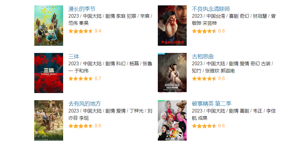 例如张颂文、张译主演的《狂飙》,辛爽《漫长的季节》,于和伟主演的《三体》,刘亦菲领衔的《去有风的敌方》等等。