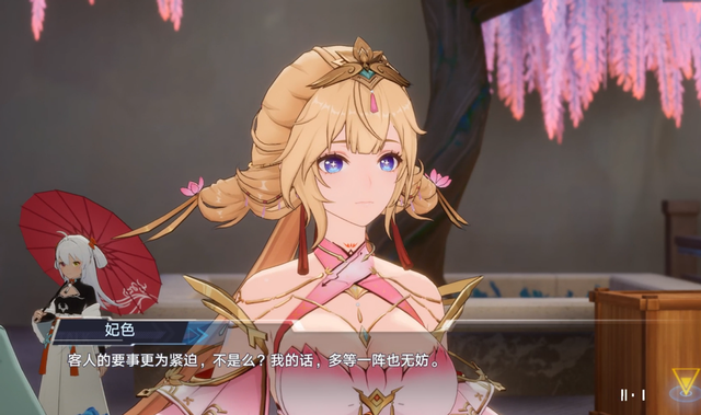 当然,还有接下来会上线的新拟态妃色,她和岚情同姐妹,却和岚风风火火的性格完全不同,妃色是姿动天下的九域第一舞姬,身穿粉色的舞裙,裙摆像花瓣一样飘逸,平时说话温声细语的,就连武器都是漂亮的莲花形状,总之在我村某人看来,妃色简直就是温柔的代名词了。在主线剧情中,我们购买的材料库存不足,妃色慷慨的把自己那一份让给了我们,还善解人意的表示自己不着急用,反正我都迫不及待想等妃色上线了。