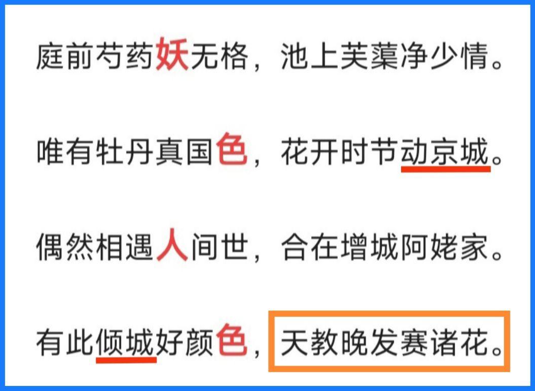 又《赏牡丹诗》云:‘庭前芍药妖无格,池上芙蕖净少情,唯有牡丹真国色,花开时节动京城。’又云:‘有此倾城好颜色,天教晚发赛诸花。’而清朝康熙年间翰林院学士们编撰的《御制佩文斋广群芳谱》将两首诗合为《赏牡丹二首》。