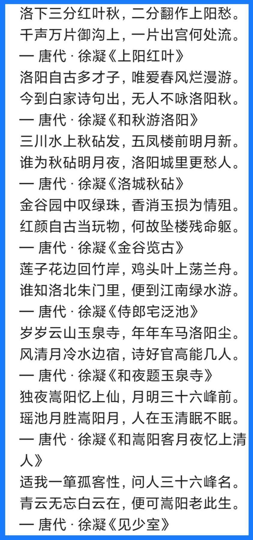 比如刘禹锡同时代的诗人徐凝,没有一首诗明确描写长安(只在一首诗里提了个“忆长安”)。但是徐凝长时间在洛阳游访,所以创作了多首与洛阳有关的诗作(见下图)。