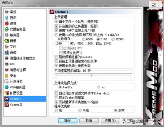 使用"NAFC"监控上传/下载:NAFC这个功能简单说是更合理的使用你的带宽,推荐。使用1:3比例限制下载:开启后,说明你的上传小于11K 的时候,这个就会限制你的下载速度。有些人肯定纳闷了,为什么会有这个选项呢?这个是因为,当初eMule Xtreme是为了那些上传者而设计的。所以早前的上传狂人们都很喜欢这个软件的设计。