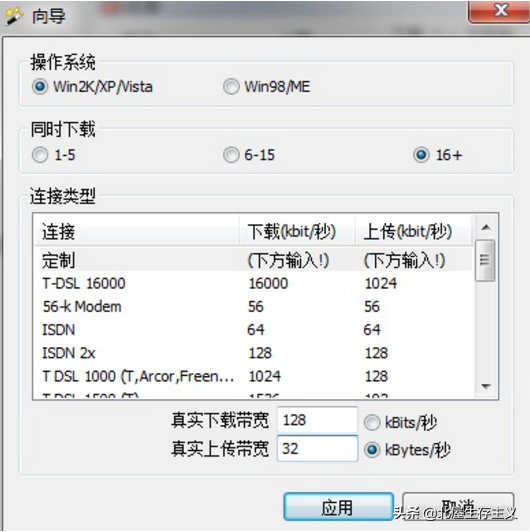 如图,以网络1M为例,选择kBytes/秒,非光纤用户标准下载为128(k),上传为32(k)(下载的1/4)。光纤用户,下载上传一样,为128(k)。无论你是几M的网,自己都可以简单计算出如何填写。点击应用。上述的所有项都会自动设置好。
