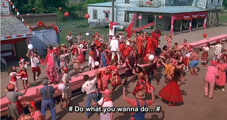 而原本的镇上的女性们对于这三个变装人是什么态度呢?除了嘲讽,再无其它。在短短时间内,他们的态度发生了一百八十度的转弯,最终完成了对于两种不同的态度之间的融洽相处,这样的交流意义重大。