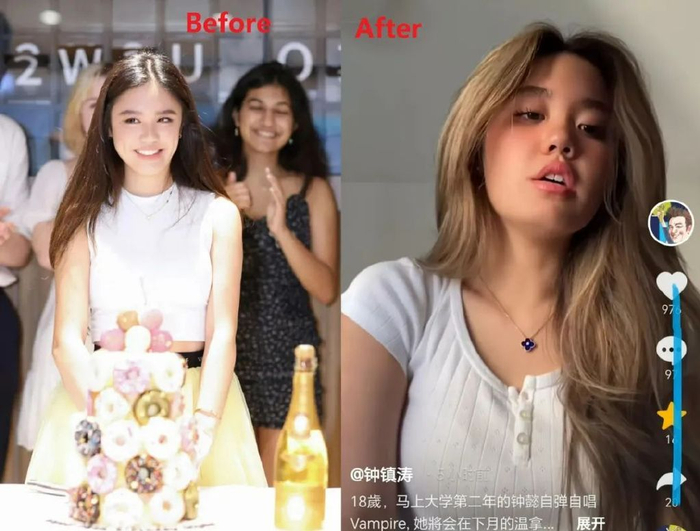 钟懿在入乡随俗方面做得不错,刚到英国时还是一头黑长直秀发,才不到一年,妆容上就欧美范十足了,前后对比判若两人。