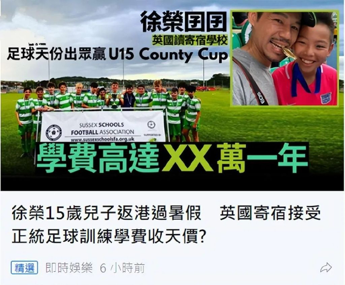 他年近七十还那么努力,看来送女儿去英国读书的开销真不小。出国读书,无论学费还是生活开销,都是非常烧钱的。TVB金牌绿叶徐荣的儿子徐朗非常爱踢足球,能力出众,徐荣非常支持儿子,他才13岁时就开始被送到英国读专业学校。