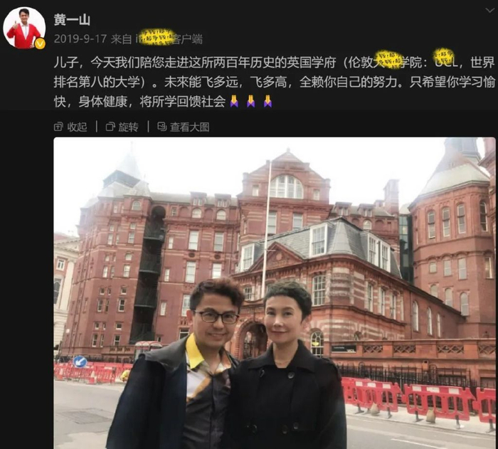 黄一山的小儿子黄颂匡跟骆欣言上的是同一所大学,是她的学长。黄一山非常为儿子自豪,夫妻俩送儿子到学校报到,还跟网友分享了喜讯。
