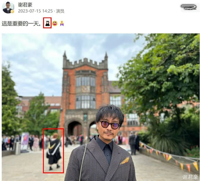 日前,60岁的谢君豪罕见晒出了一组靓照,配文“这是重要的一天”(含一个学士服表情)。照片里的谢君豪打扮精致,喜悦之情溢于言表,照片背景是一所大学,很多学生穿着学士服在拍照。
