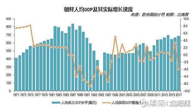 韩国在1977年人均GDP超过1000美元,达到1055美元后,和朝鲜拉开差距,此后差距不断加大。到苏联解体的1991年,韩国人均GDP为7636美元,朝鲜人均GDP为663美元,两者差距已达10倍以上。朝鲜人均GDP峰值出现在1987年,为836美元。