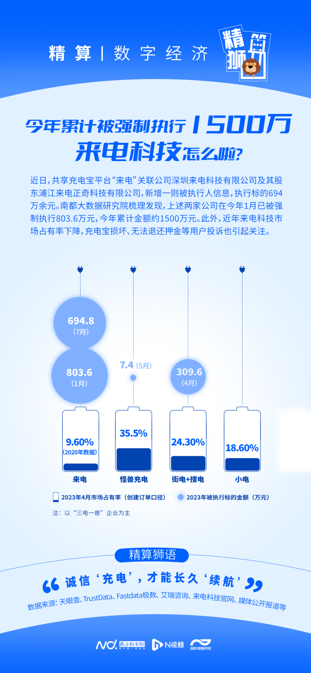 近日,共享充电宝平台“来电”关联公司深圳来电科技有限公司及其股东浦江来电正奇科技有限公司,新增一则被执行人信息,执行标的694万余元。南都大数据研究院梳理发现,上述两家公司在今年1月已被强制执行803.6万元,今年累计金额约1500万元。此外,近年来电科技市场占有率下降,充电宝损坏、无法退还押金等用户投诉也引起关注。