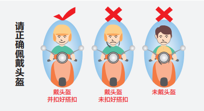 4.安全帽,要系牢,正确佩戴很重要。头部是人体最脆弱也是最容易受到致命伤害的部位,电动车骑行者一旦发生事故,头部与坚硬的路面或电线杆、行道树碰撞,无异于以卵击石。