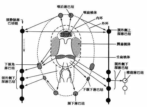 内、外环各自内部的淋巴组织相互通连,且内环淋巴流向外环,互相之间均以淋巴管相通。外环的淋巴又流向颈外侧上深淋巴结及颈外侧下深淋巴结。因椎前淋巴结与所有咽部淋巴径路间接相通,在临床上特别和舌根及喉咽部肿瘤关系紧密。另外,舌根部、软腭及鼻咽部的淋巴管可通向双侧,故这些部位的恶性肿瘤可能出现对侧淋巴结转移(图1)。