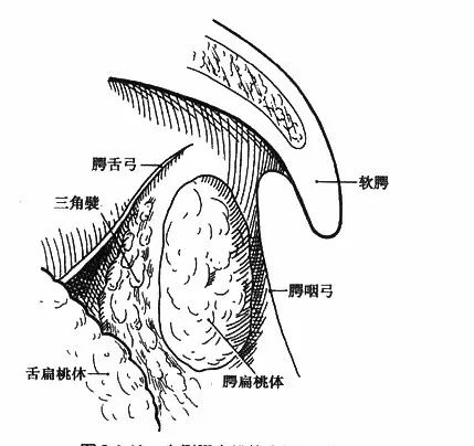 腭扁桃体(palatine tonsil)习称扁桃体,左右各一。位于口咽两侧腭舌弓和腭咽弓之间的三角形扁桃体窝内。为咽淋巴组织中最大者。此窝前界为腭舌弓,后界为腭咽弓,外侧则隔扁桃体周围隙以咽上缩肌为界(图2)。