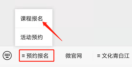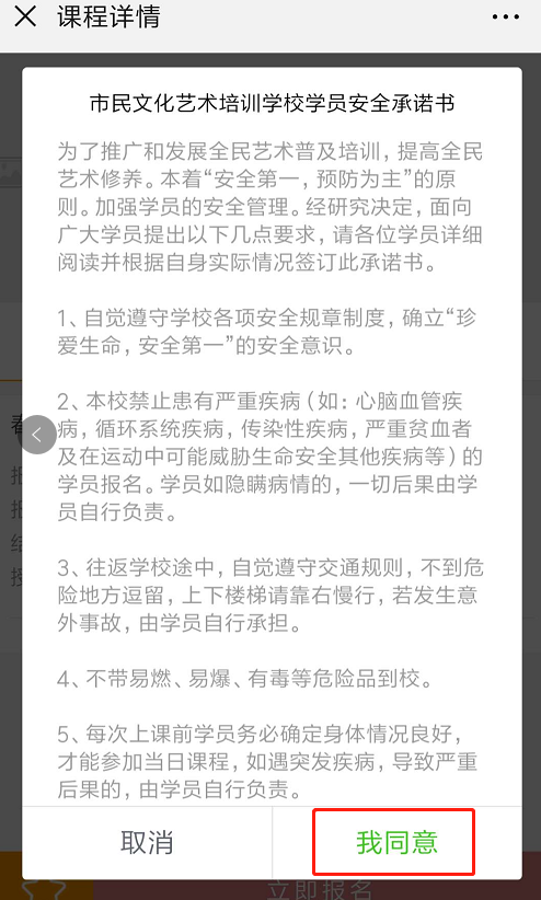 ③点击菜单栏【预约报名】→【课程报名】,选择您喜爱的课程,点击我要报名,同意即可。