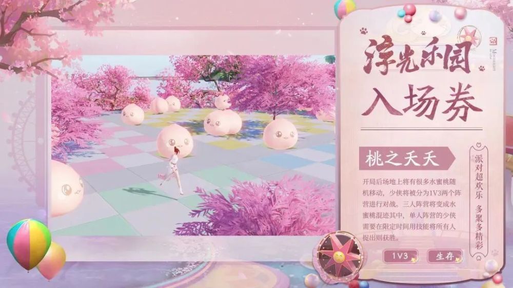 场地上将有很多随机移动的水蜜桃,三人阵营变成水蜜桃混迹其中,一人阵营需要在限定时间用技能将所有人抓出来。