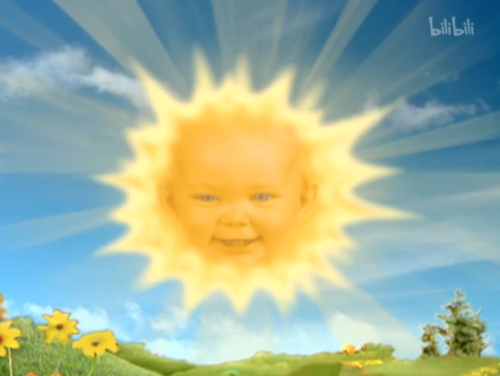 伴随着欢快的音乐,太阳宝宝咯咯笑着从地平线上升起;镜头缓缓推进,越过广阔的草地、彩色的花朵和毛茸茸的兔子,停在山丘状的小屋子上,四个色彩斑斓的小家伙跳出来,奶声奶气地喊道——