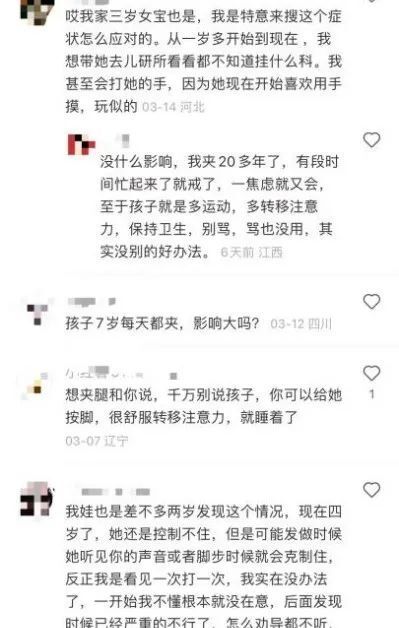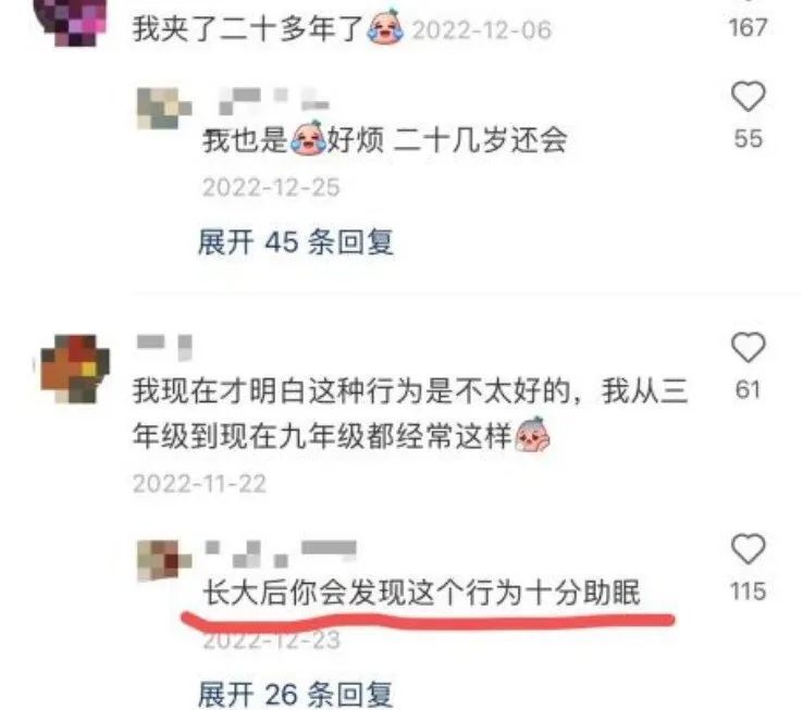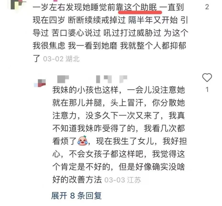 儿童通过摩擦双腿、夹紧腿部产生兴奋感,有些孩子会在这种兴奋感之后获得安抚感。我在评论区看到有不少人说“夹腿之后整个人大汗淋漓,很放松,很快就能入睡”等等。