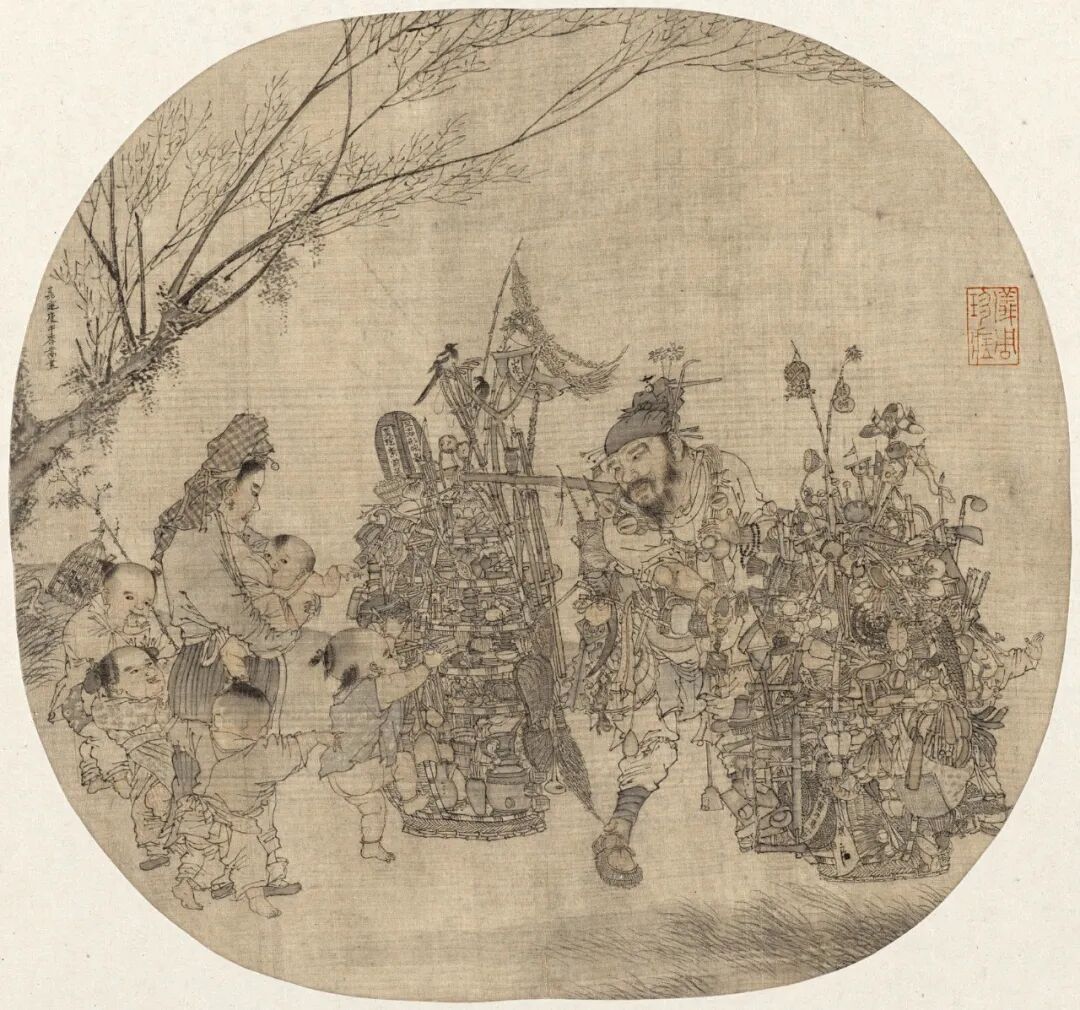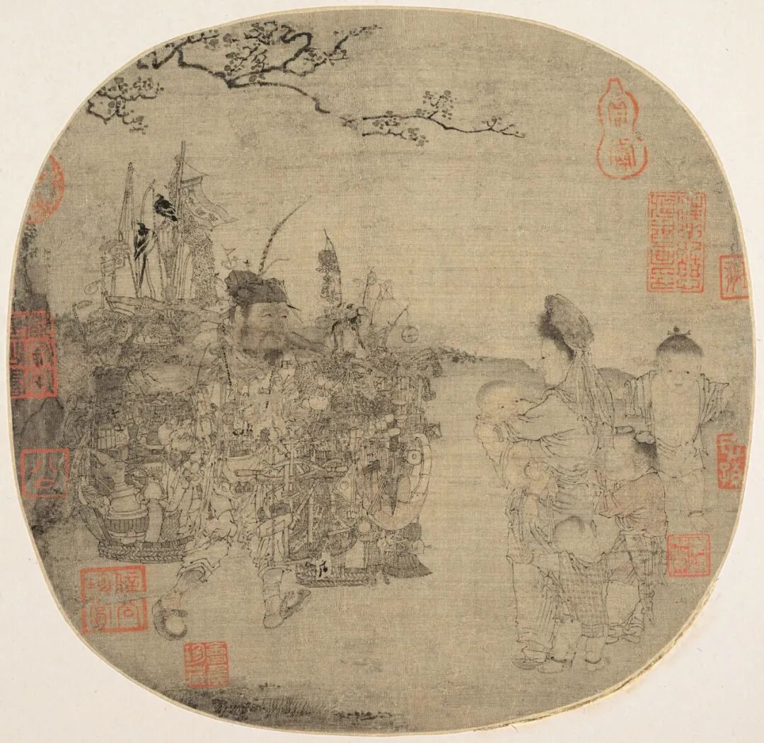 今天我们仍能通过考察文献了解两宋皇室为保育幼儿、驱病避祸几乎想尽各种办法。其中以图影造像作为保育幼儿,祈福多子的手段最为常见。如宋仁宗赵祯由于两位皇子豫王、鄂王相继夭折,为祈求早生皇子,于景祐四年(1037)二月,“置赤帝像于宫中祈嗣”。哲宗唯一的皇子与三岁的爱女仅隔四日先后夭折,这对哲宗打击无疑致命,“自皇子薨,即不御殿,辅臣等同入札子乞对,不许”。刘婷玉的研究阐述了南宋由于皇子早夭极为普遍,造成皇室企图用婴戏图祈福多子。尤其是李嵩创作生涯最为成熟的宁、理二朝,皇子近乎全部夭折。1210年之前,宁宗所生6个皇子均不过周岁即先后夭折,这无疑使得整个皇宫,甚至整个天下都笼罩在恐怖气氛与疫病阴霾之下。于是便在嘉泰三年(1203)九月,下诏图绘祭祀感生帝、太子星、庶子星以驱邪避祸。施莉亚也认为,无论是出于政府对收养弃子的救助,还是皇室出于祈福多子,此一时期的婴戏图广为盛行,均与此有关。现存美国克利夫兰艺术博物馆的无款团扇《百子图》,黄小峰认为此图是目前存世最早、最为可信的宋代皇家御制“百子图”。由于画中罕见地绘入了女童形象,因此很可能是皇室授意画院为怀念逝去的年幼公主而制。在一种以男孩为传统图式的百子图中,有意绘入女孩形象,显然已是明显在强调对于女童的重视与保护。同样是服务于南宋宁、理宗时期的院画家陈清波,所绘《瑶台步月图》描绘的正是宫中女眷于七夕之夜,手捧摩睺罗的祈祷景象,根据摩睺罗众所周知的求子宜男用途,所祈祷内容便可想而知。