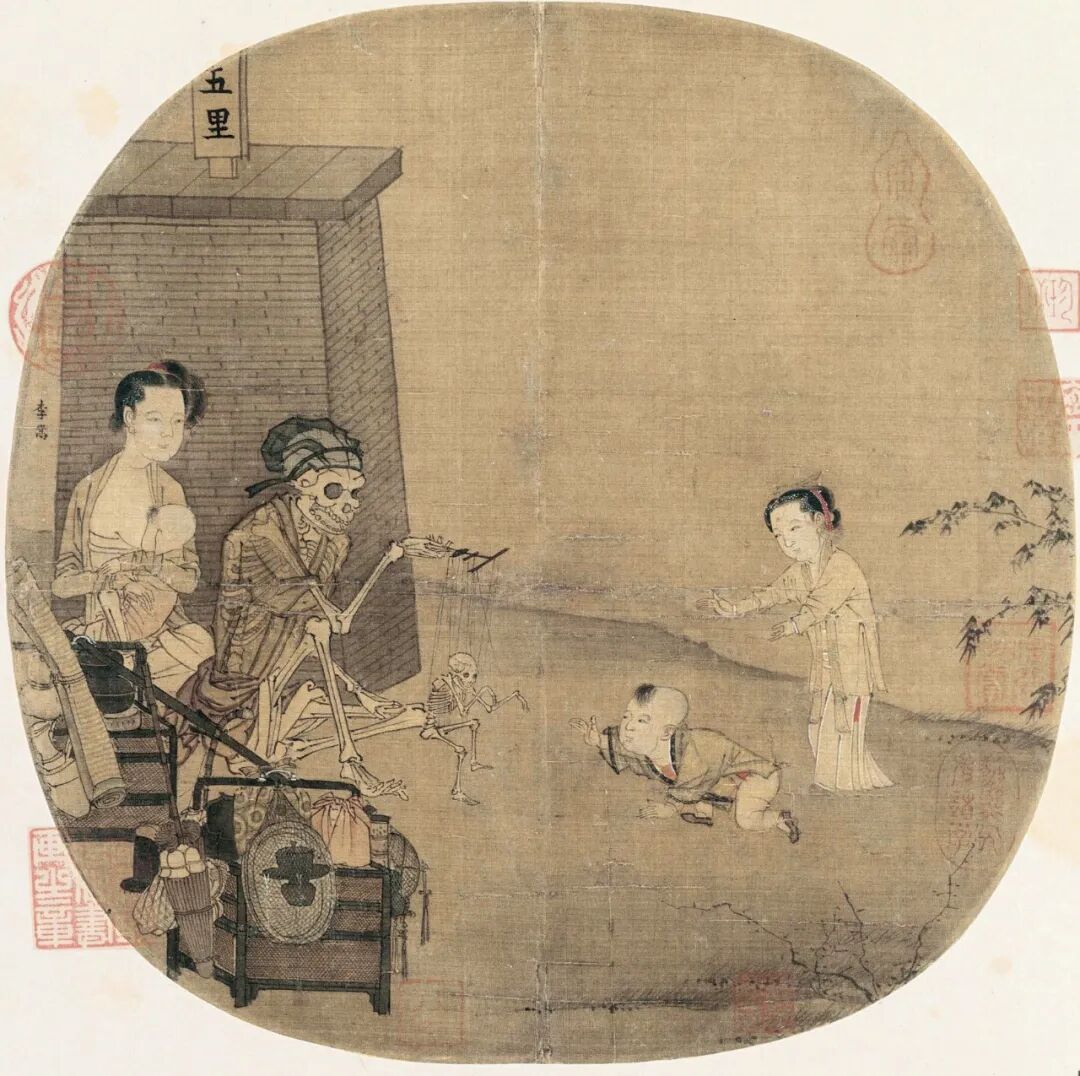 从《骷髅幻戏图》作者李嵩供职画院的宁、理朝看,文献载宋宁宗属鲁钝型精神发育迟滞,周密《癸辛杂识》载,“宁宗不慧讷于言,每北使入见,或阴使宦者代答”。和宁宗的鲁钝相比,理宗无子,过继的皇位继承者度宗赵禥精神发育迟滞程度更为严重。不仅语言能力底下,理解力也很差。《宋史》载,“理宗问今日讲何经,答之是,则赐坐赐茶;否则为之反覆剖析;又不通,则继以怒,明日须更覆讲”。上述情境在赵宋王朝进入尾声时,伴随内忧外患,无异于雪上加霜。黄小峰认为宋代皇室利用图像进行祛病避祸,祈求延年益寿,逢凶化吉的祈愿行为十分普遍。