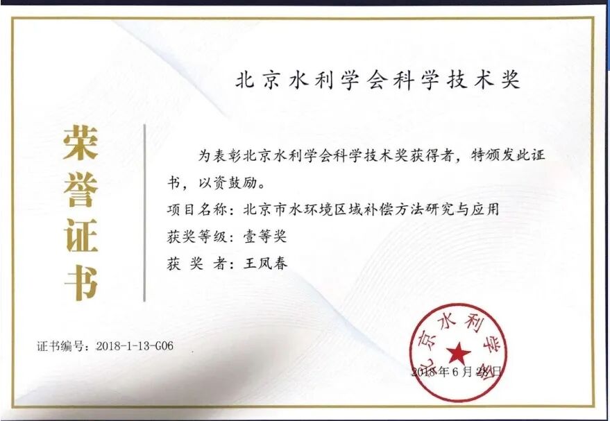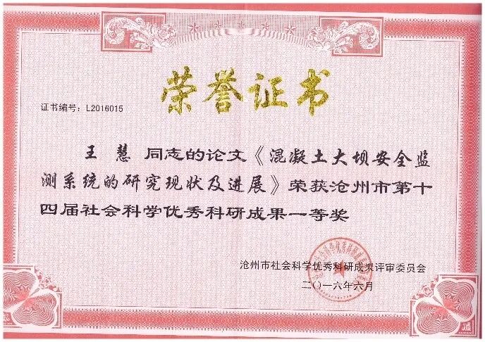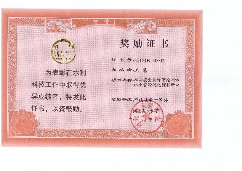 3、2018年,主持或参与科研项目获得河北省水利学会科技进步奖二等奖、三等奖各一项。