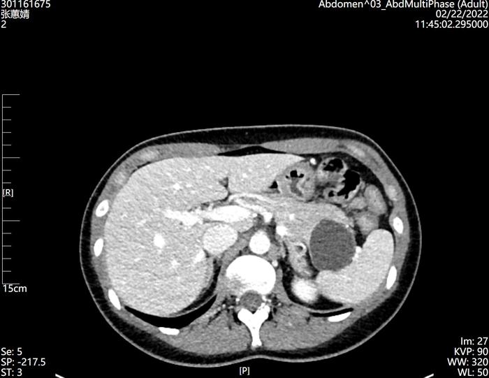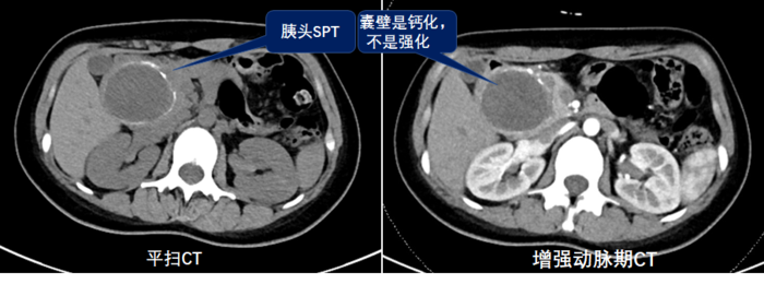 粘液性囊腺瘤(MCN),女性多见,影像特点:单房多见,囊壁可能有钙化(蛋壳样),体尾部多见;病理特点:MCN肿瘤多为囊性,囊壁内衬单层粘液柱状上皮,上皮下方为卵巢样间质。潜在恶性,建议手术。(下图为一例典型的MCN的CT表现,囊壁会有轻度强化)