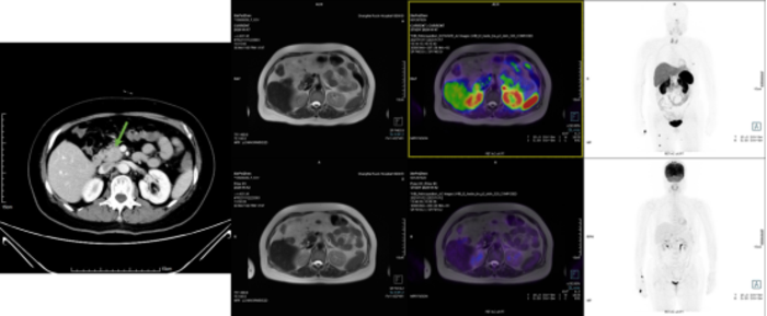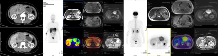 胰母细胞瘤,是一类罕见的胰腺外分泌恶性肿瘤,占所有胰腺外分泌恶性肿瘤<1%,多见于婴儿和儿童,但也会出现在成人中,男女比例接近。病变可以发生在胰腺各个部位,通常为实性肿块,约30%的胰母细胞瘤会分泌AFP。组织学上,胰母细胞瘤由可能混杂腺泡、导管、胰岛细胞的原始小多角形或梭形细胞组成,免疫染色可查见由腺泡、导管或内分泌标志物。原始细胞中可见特征性“鳞状”小体。成人胰母细胞瘤似乎较儿童差,局限性肿瘤手术切除为首选。胰母细胞瘤在CT扫描下显示为一巨大的边界清楚的分叶状肿瘤,可伴有钙化。(下图为一例成人胰母细胞瘤病例,需要注意肿瘤少量表达SSTR2A,故68Ga-DOTATATE PETMRI显示DOTATATE摄取增高,易与神经内分泌肿瘤混淆)
