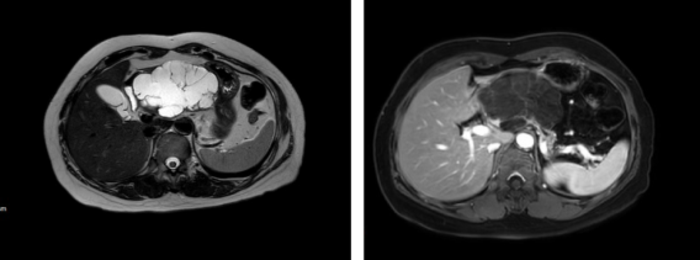 浆液性囊腺瘤(SCN),多发微囊,中央可有瘢痕,CT增强后表现为轻度强化,中心钙化,“石榴”,这个良性肿瘤,一般不需要手术,只有在出现压迫症状(腹痛,呕吐,黄疸等)或不能排除恶性肿瘤时候可考虑手术。病理特点:SCN肿瘤由大小不一的囊腔构成,内衬透明立方上皮,上皮下方为毛细血管网。(下图为一例典型的SCN的MRI表现)