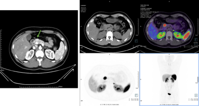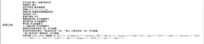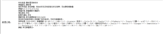 胰腺神经内分泌肿瘤(pNET),大部分为实性,但也有发生囊性变,形态学表现多样,需要与其它类型的胰腺肿瘤进行鉴别,在没有病理,没有68Ga和18FDG PET双扫描的情况下,如果贸然放弃或手术都不适合。影像学上,富血供是最具特征的,表现为增强后整体或周边明显强化、或囊实性病灶伴强化结节。病理主要靠免疫组化,AE1/3,CgA,CD56,SYN,E-cad阳性,β-catenin膜阳性。当G3级NET与NEC难以鉴别时,可进行基因突变检测,一般而言,NEC 往往具有 P53 基因突变和(或)RB 基因缺失,胰腺 NET 可能存在 MEN1、ATRX、DAXX基因突变。(下图为一例典型的pNET G2,左上为增强CT表现,右上为68Ga-DOTATATE PETCT表现,下方为病理免疫组化结果)