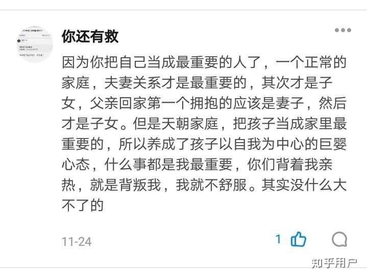 夫妻关系高于亲子关系的家庭往往能幸福地走下去,而一个劲为孩子付出不懂得自私一点让自己享受一点的夫妻,最终都会分道扬镳的(中国的离婚率其实蛮高的,到后来真的都是煎熬压抑,太为子女付出,夫妻之间很容易出现问题,而性生活对夫妻关系真的很重要)。我父母后来倒是没亲密了,经常吵闹打架,离婚,闹得鸡飞狗跳,他们关系变恶劣,有很多痛苦的事情,也让我更难受,所以我宁愿他们回到亲密的时候。有的同学觉得难受甚至希望他们不亲密,这样自己就能成为家庭的中心,觉得他们亲密了就是背叛自己没把自己当成家庭中心了,因为爱情本来就具有排他性,爱情的性行为也有排他性,你不满是因为觉得自己被排斥在外了,接受不了他们之间的夫妻关系亲密关系。因为占有欲强,所以只能接受他们的父母身份(父母身份的性质就是为孩子付出一切为你付出一切什么都以你为中心围着你转),接受不了他们互相之间的具有爱情排他性的夫妻身份亲密身份(夫妻身份就是二人世界的甜蜜,具有排他性),也是因为很多家庭都没有认识到夫妻关系应该是高于亲子关系的,太迁就导致孩子有巨婴心态,觉得就该围着自己转。