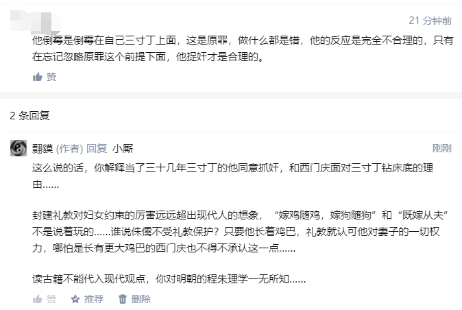 然后我顺便看了这位评论者的时间线,得知TA赞同“潘驴邓小闲”论,亦即认可潘金莲出轨杀夫合理性……